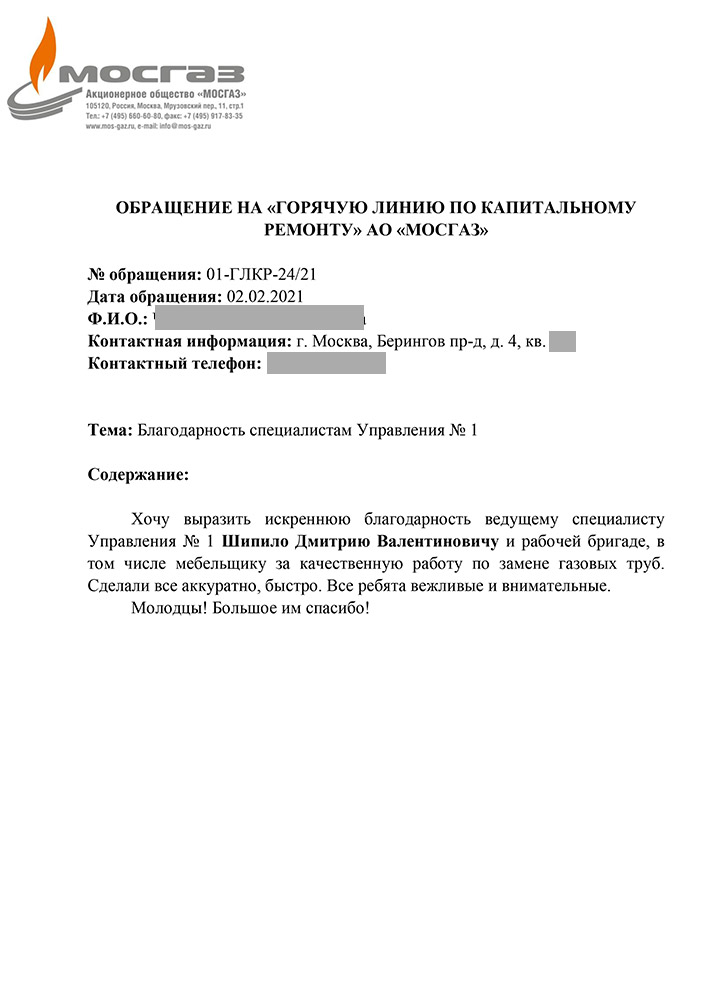 Отзывы и благодарности жителей о замене внутридомовых систем газоснабжения по программе Фонда капитального ремонта.